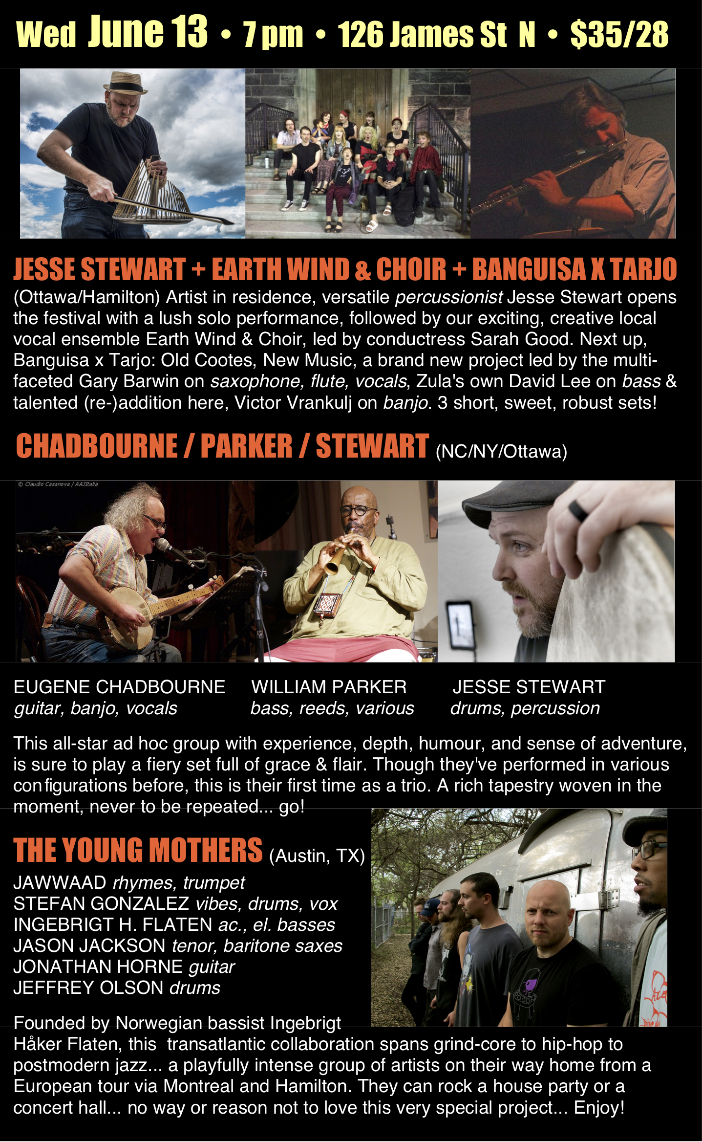 Hamilton welcomes back Jesse Stewart! Local jazz fans are still talking about the Ottawa-based drummer’s last appearance here in 2016, when he wowed the audience at the Art Gallery of Hamilton with his collective trio Sonoluminescence, with David Mott baritone saxophone and William Parker bass. This year, Jesse Stewart is the Something Else! Festival Artist in Residence, so Hamilton gets to spend five days with this award-winning composer, percussionist, visual artist, sound artist, instrument builder, researcher, writer, and educator. As well as his commitment to fostering community health through music, art, and education, Jesse has collaborated in performance and recordings with such giants of contemporary music as Pauline Oliveros, Evan Parker, Hamid Drake, Roswell Rudd, Jane Bunnett, and Pandit Anindo Chatterjee. Opening the festival with a solo percussion performance, and closing it with a concert by his Juno Award-winning Stretch Orchestra, in between Jesse performs with visiting and local players alike, including Michael Snow, Joe McPhee, Heather Cornell, and Eugene Chadbourne, as well as making a return appearance with Sonoluminescence.