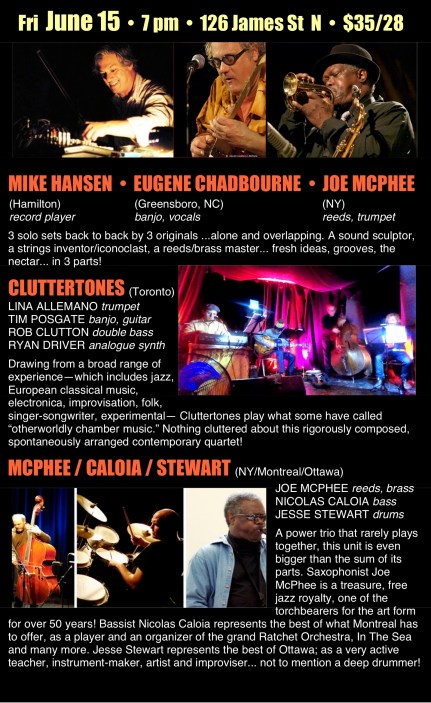 A power trio that rarely plays together, this unit is even bigger than the sum of its parts. Saxophonist Joe McPhee is a treasure, free jazz royalty, one of the torchbearers for the art form for over 50 years! Bassist Nicolas Caloia represents the best of what Montreal has to offer, as a player and an organizer of the grand Ratchet Orchestra, In The Sea and many more. Jesse Stewart represents the best of Ottawa; as a very active teacher, instrument-maker, artist and improviser… not to mention a deep drummer!