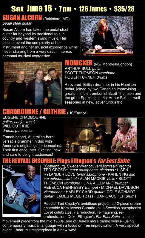 Baltimore-based Susan Alcorn has taken the pedal steel guitar far beyond its traditional role in country and western swing music. Known among steel guitarists for her virtuosity and authenticity in a traditional context, Alcorn first paid her dues in Texas country & western bands. Soon she began to expand the vocabulary of her instrument through her study of modern classical music, Pauline Oliveros’ “deep listening,” Astor Piazzolla’s nuevo tango, free jazz, and world musics (Indian rags, South American songs, and gamelan orchestra). Her pieces exploit the amazing complexity of her instrument while never straying from a very direct, intense, and personal musical expression. Her last Hamilton appearance included original works, improvisations with local players, and a solo pedal steel guitar version of Olivier Messaien’s And I Await the Resurrection of the Dead. The UK Guardian describes her music as “beautiful, glassy and liquid, however far she strays from pulse and conventional harmony.”
