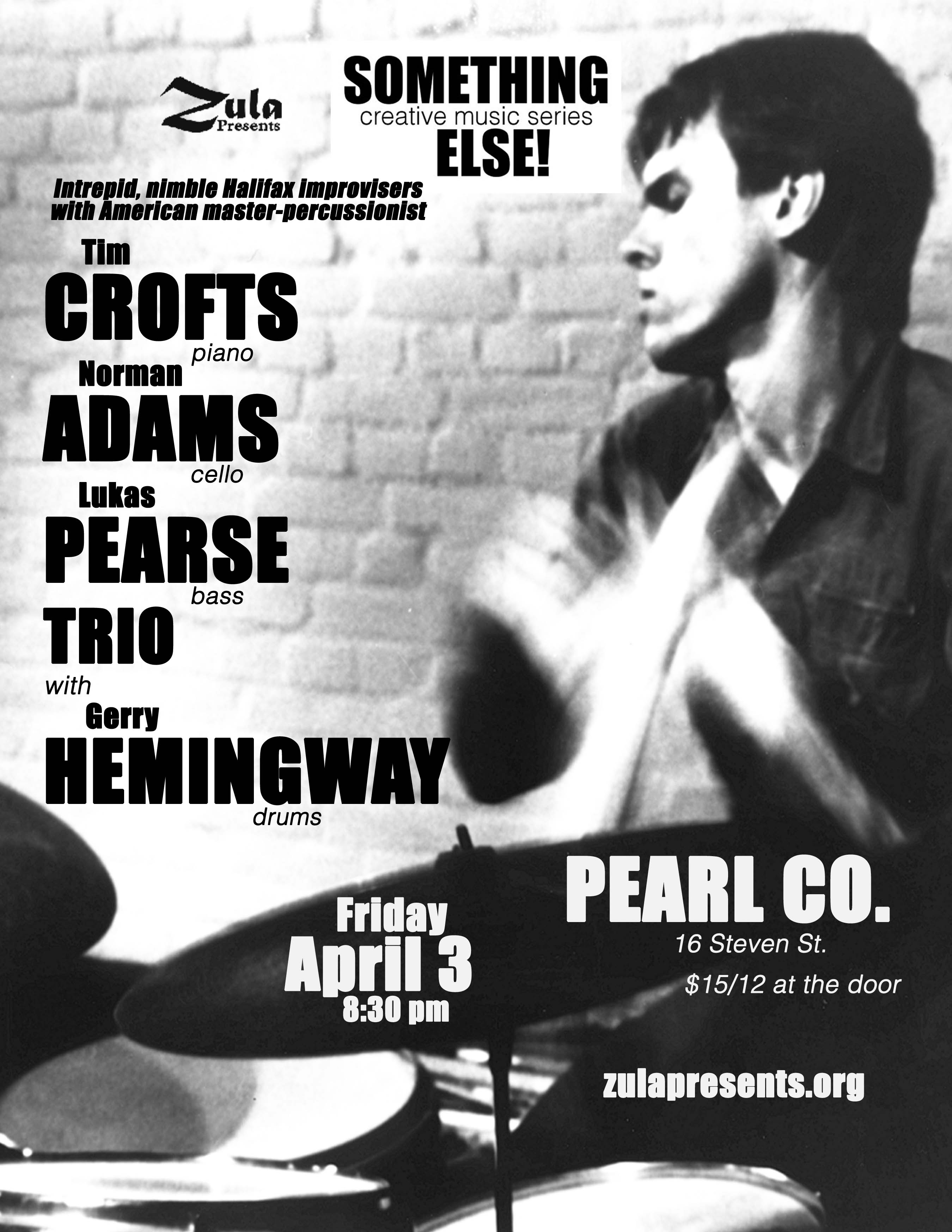Intrepid, nimble improvising Halifax trio of Tim Crofts (piano), Norman Adams (cello) and Lukas Pearse (bass) will be joined by American master-percussionist, composer Gerry Hemingway, who is perhaps best known as an Anthony Braxton Quartet alumni. This most virtuous unit will grace the Pearl Company stage as part of their coast to coast Canadian tour of select cities (Halifax, Montreal, Vancouver, Victoria, Hamilton, Guelph, Toronto). The trio, considered “one of Atlantic Canada’s most creative free music ensembles”, has been presented numerous times on the suddenlyLISTEN Series, at the Festival des Musiques de Création Jonquière, The Halifax Jazz Festival and Re:Flux Festival. With the addition of Hemingway, fresh, spontaneous interaction is the heart and soul of this unit. The trio has released their first album, Sonomatopia, in 2008 and a second release, Literal Lateral, followed with Hemingway recently. Don’t miss this Hamilton first!